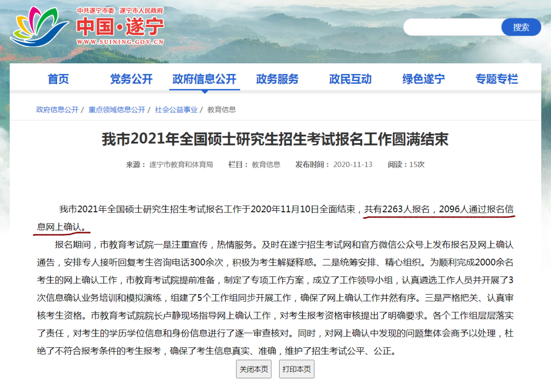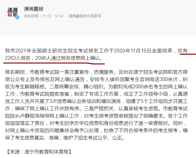 我市2021年全国硕士研究生招生考试报名工作于2020年11月10日全面结束,共有2263人报名,2096人通过报名信息网上确认。