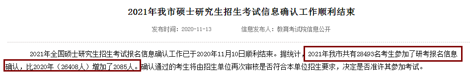 据统计,2021年我市共有28493名考生参加了研考报名信息确认,比2020年(26408人)增加了2085人。