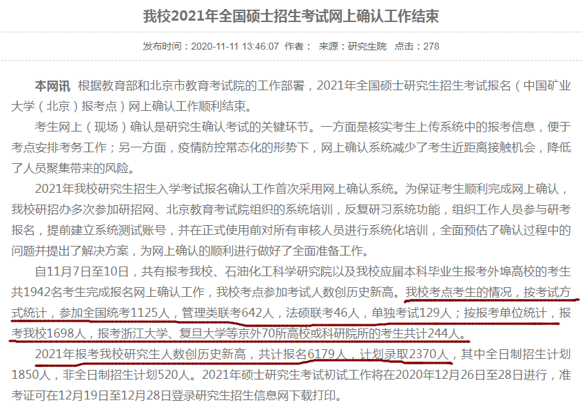 中国矿业大学(北京)的报考人数情况就交代得非常详细,不仅有报考点人数还有报考单位数据。