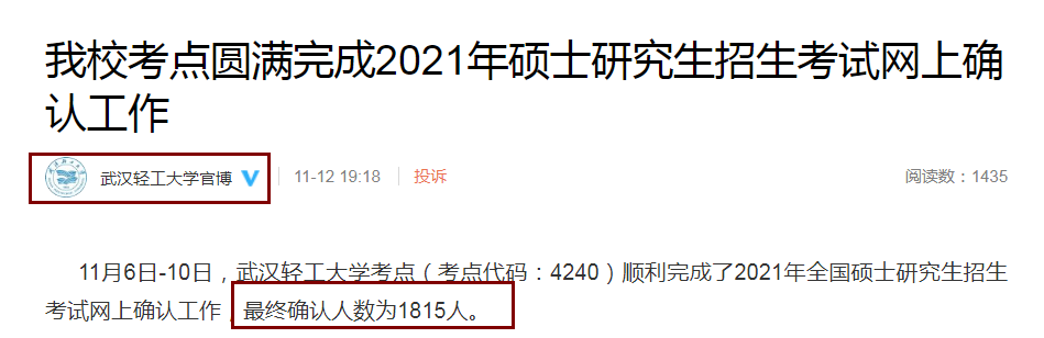 11月6日-10日,武汉轻工大学考点(考点代码:4240)顺利完成了2021年全国硕士研究生招生考试网上确认工作,最终确认人数为1815人。