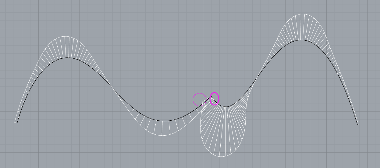 上图为G0连续时的曲率梳,可以明显看到两条曲线的曲率梳是断开的,即两个粉色圆圈标识的地方