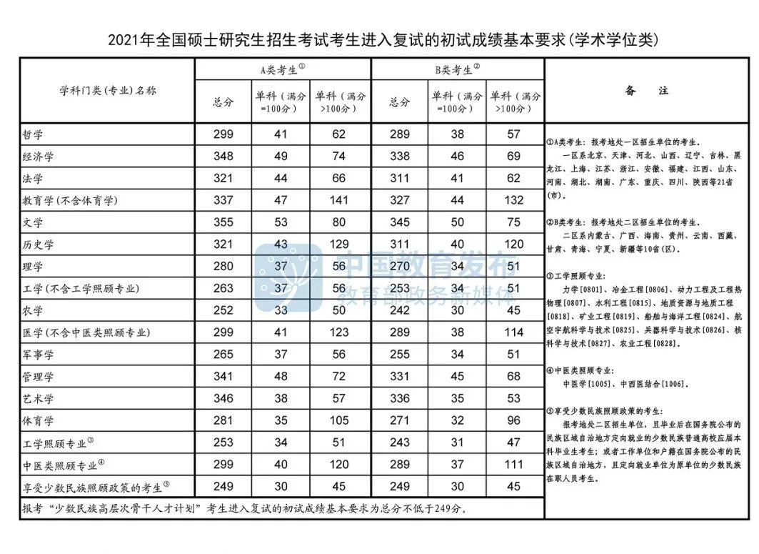 2021年全国硕士研究生招生考试国家分数线公布