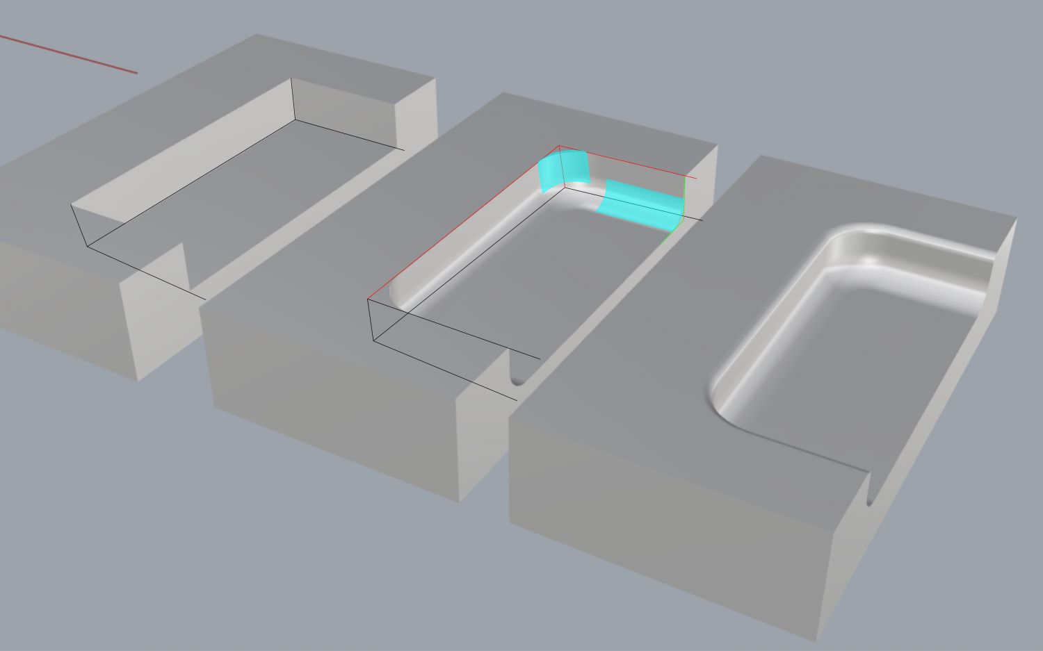 如上图所示,一般加材料都是在模型的内侧进行倒圆角处理时候,圆角边变成圆角面,此时进行加材料,如上图 竖直红色线为原始边,进行圆角后,青色区域为加材料区域