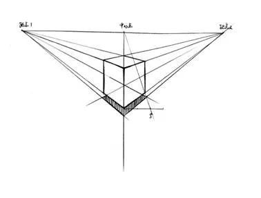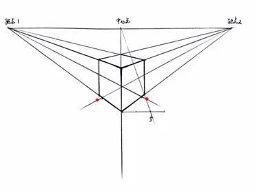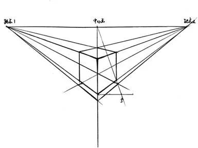 4.将作完垂线所得的交点与距点1相连,得到一条线段,再从距点2过视线与所得线段的交点作一条线,并向下作垂线,此时两点透视的立方体绘制完成;