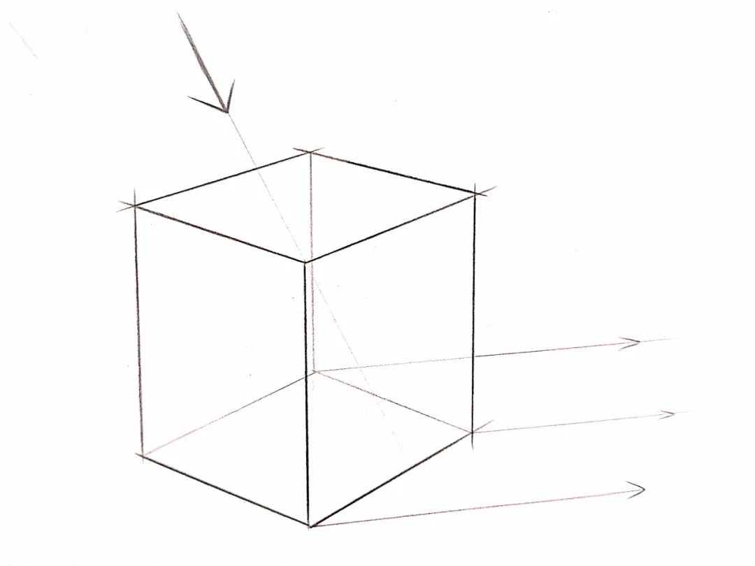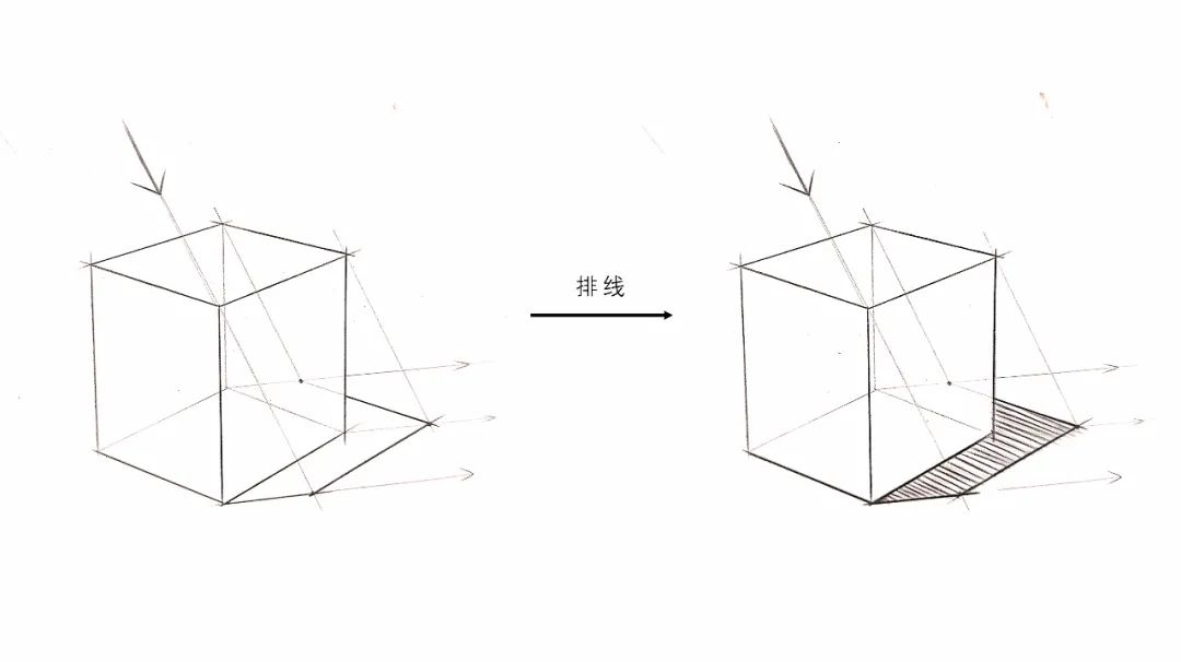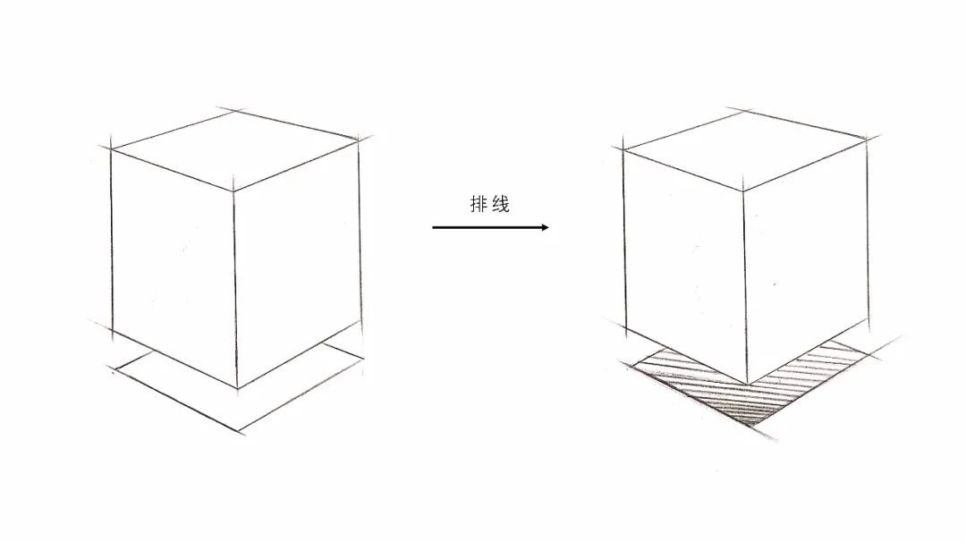 步骤2:接着我们将背光面进行排线,此时一个方体的受光与不受光面我们分出来了,一般情况下我们只讲物体上的排线画到这个程度就可以了,为了更好地区分出侧光面,我们进行了下一步的分析;
