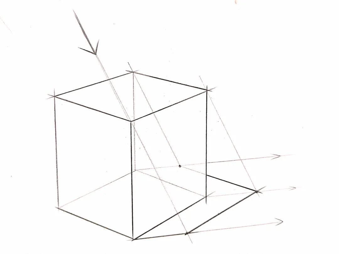 步骤2:从物体底部延长出投影的方向,出发点为背光面与底面相接触的三个交点;