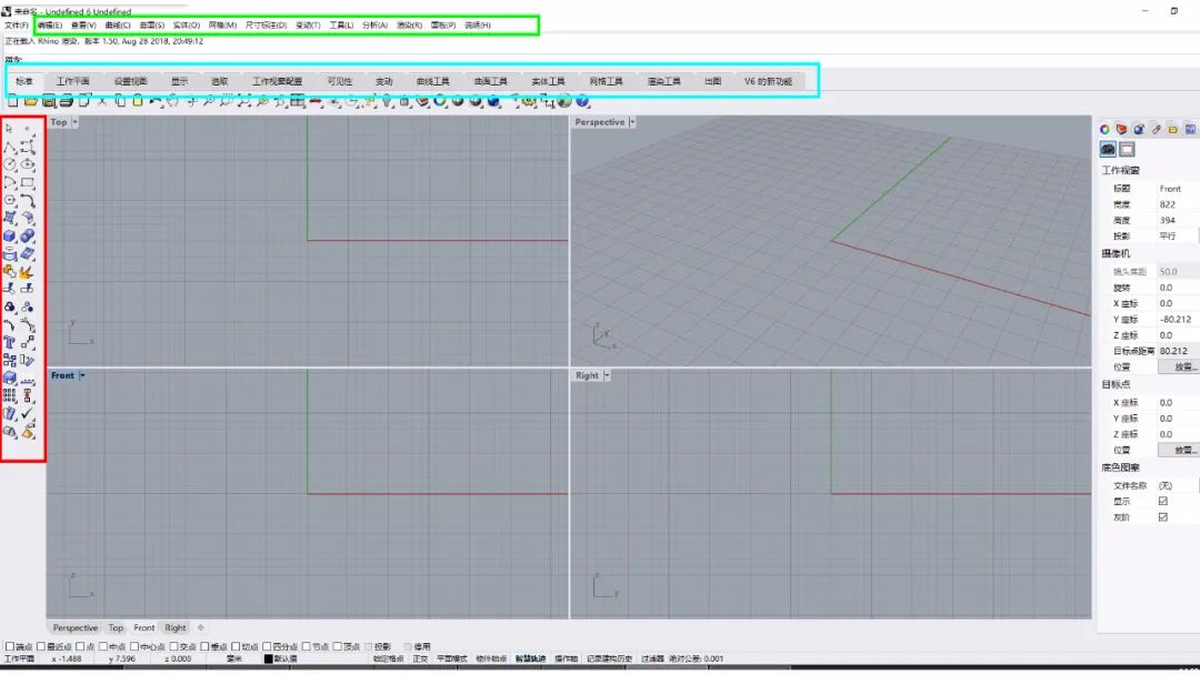 如图所示,犀牛截面可见,犀牛命令主要分布在:绿色条所示的 菜单栏,青色条所示的 常用面板,红色命令所示的 红色工具条。