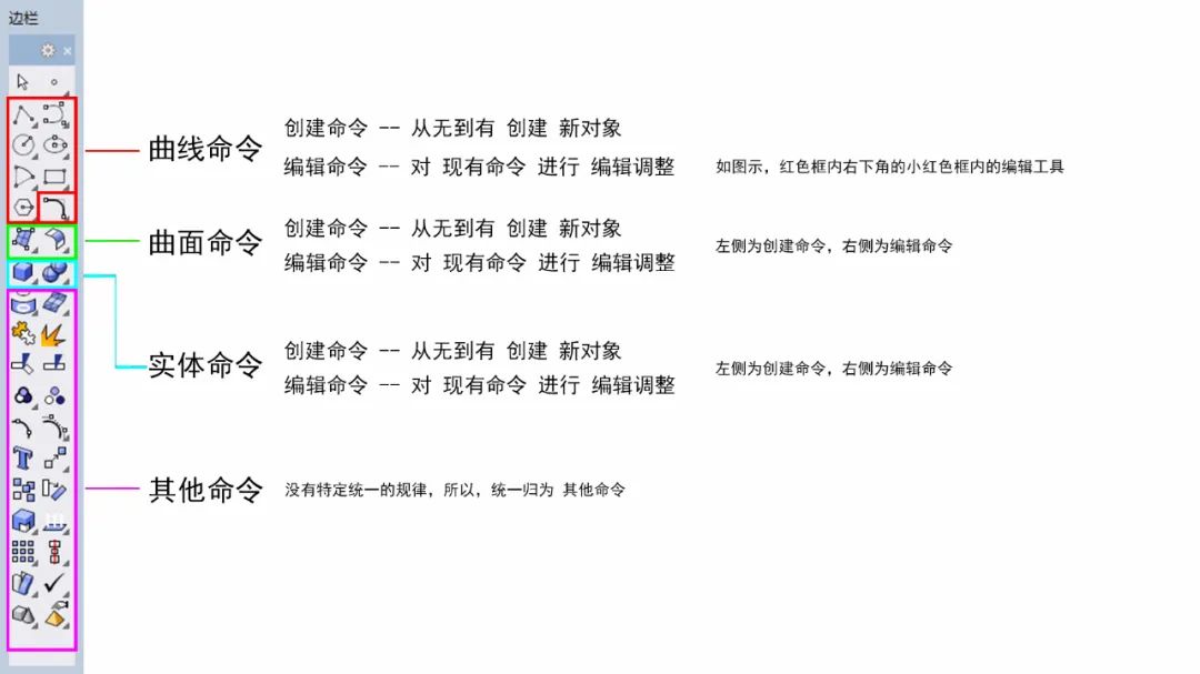 将前面所示红色工具条的命令栏放大后,可跟进命令属性进行分类,分为:曲线命令,曲面命令,实体命令,其他命令。其中,线、面、体三类命令根据功能又可以分为 创建命令---从无到有创建新对象,编辑命令---对已有对象进行修改完善。