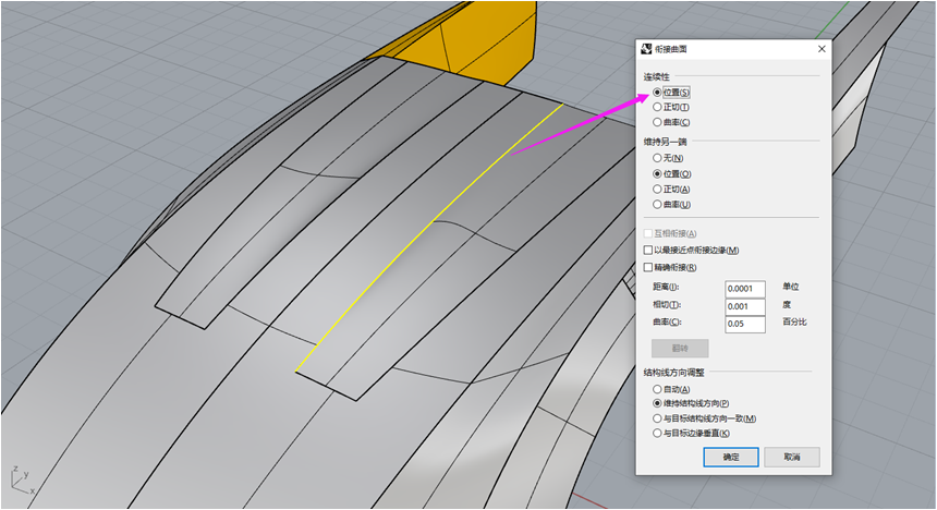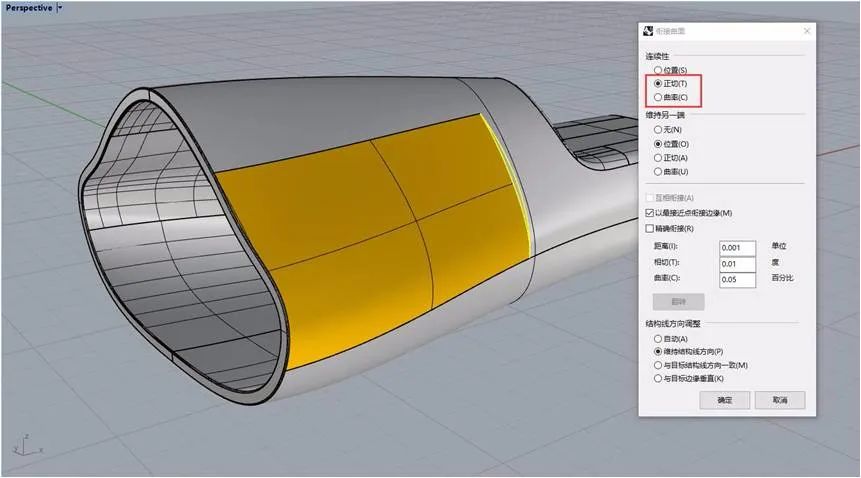2、连续性设置为:位置连续(G0)、相切连续(G1)、曲率连续(G2)、G3、 G4。