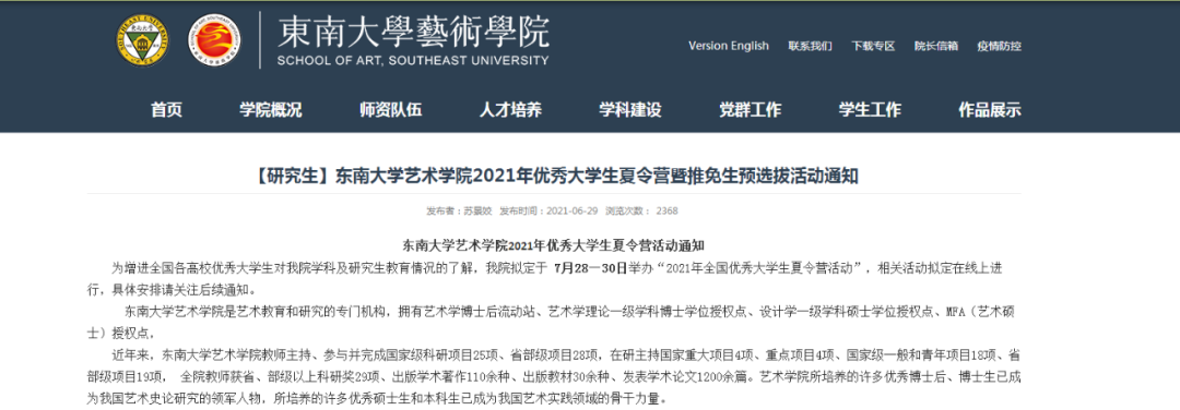 东南大学艺术学院2021年优秀大学生夏令营活动通知