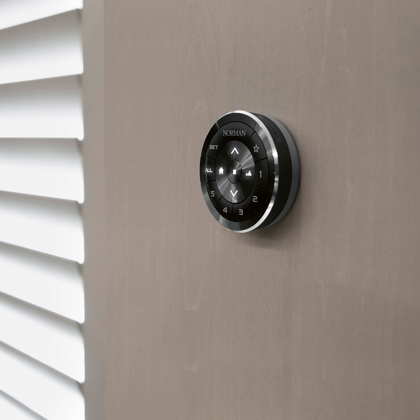 作为智能家居工具包的一部分,用于百叶窗的 NM 拨号遥控器可将任何家庭转变为现代、科技响应的生活空间。操作简单直观,可通过 iPhone/iPad 完成。只需转动外圈刻度盘,百叶窗就会立即调整到所需的精确角度。