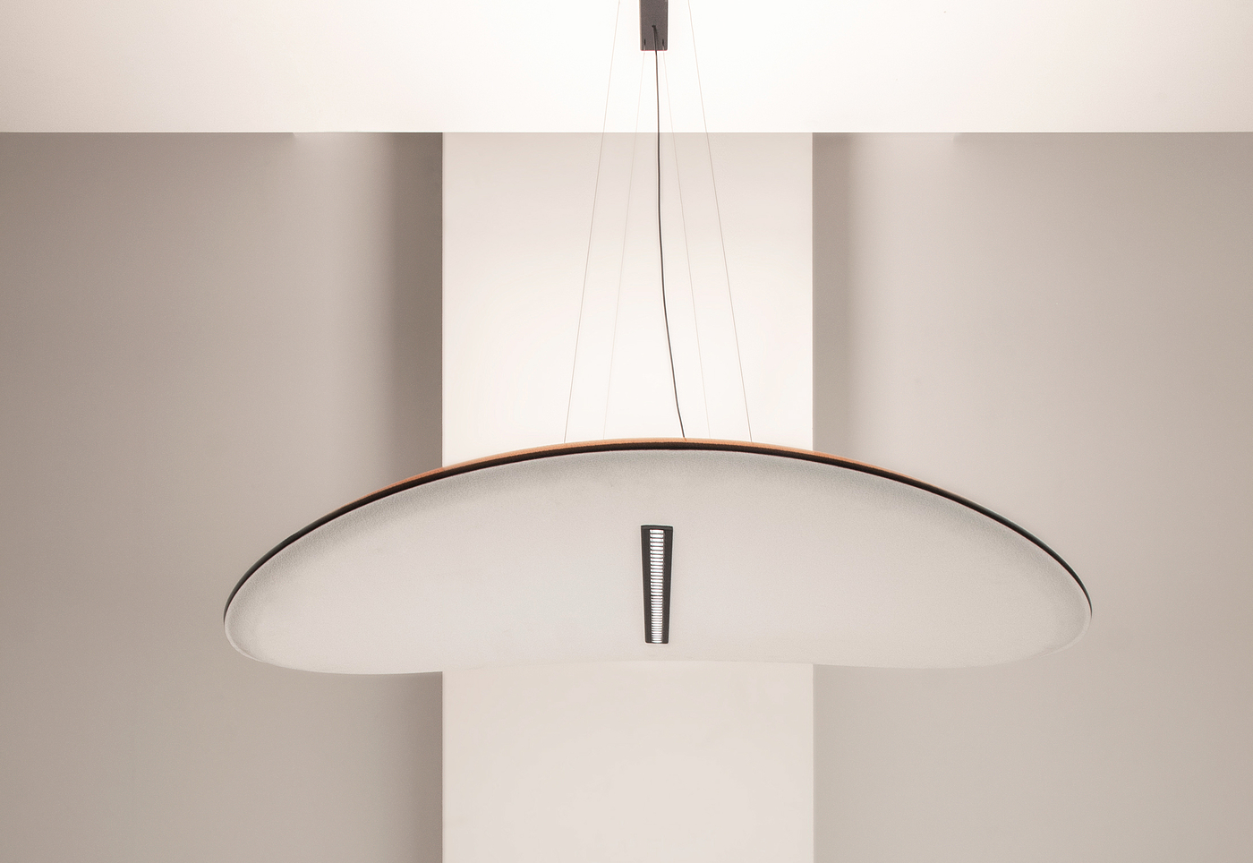 Derby是一种结合吸音体和高档LED光源的灯具,大型吊灯的弧形造型勾勒出一个狭窄的 LED 灯条。