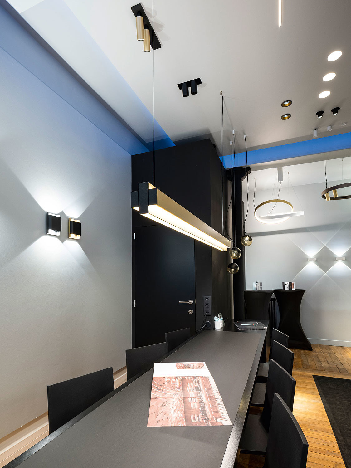 独特的十字形轮廓允许多达五道光线:三道用于直接照明,两道用于酒吧柜台、接待台或会议桌上方的间接照明。
