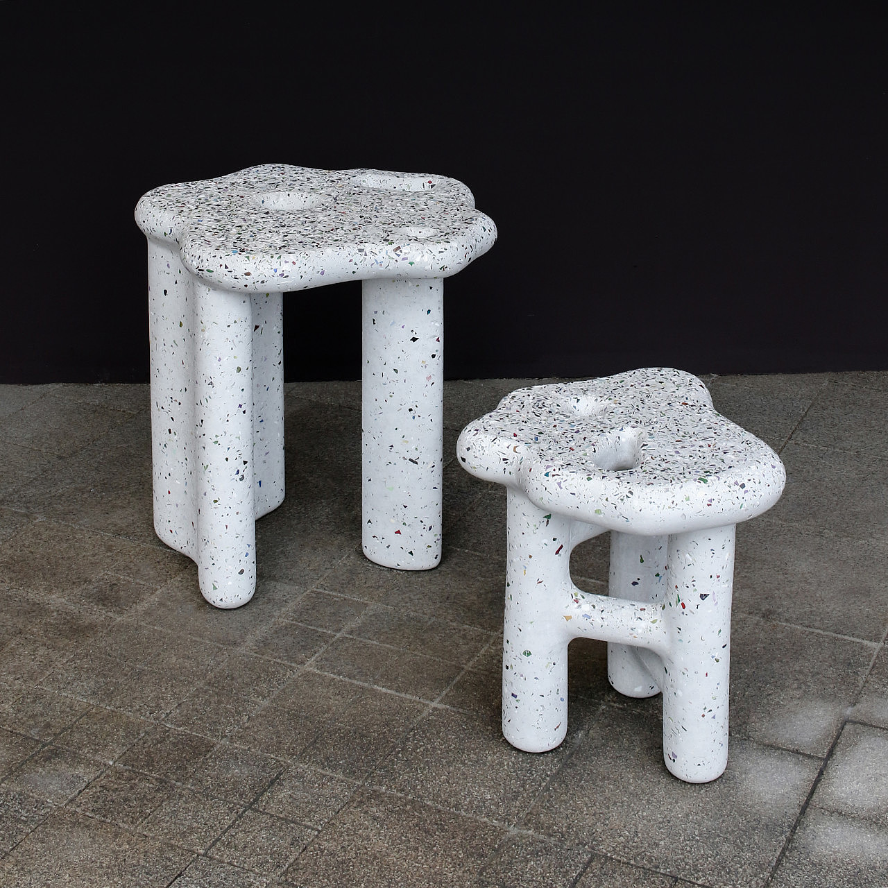 为了提高人们对回收塑料垃圾的意识,Hakmin把消费者通过爱茉莉太平洋绿色循环运动回收的空化妆品瓶变成碎片,并与UHPC混凝土混合。最终的结果是一种类似水磨石图案的材料,Hakmin用这种材料创造了由长凳、边桌和凳子组成的碎片家具系列。