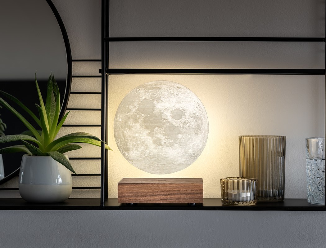 这款抗重力月灯似乎神奇地“漂浮”在胡桃木或白蜡木底座上方,并像真正的椭圆轨道月亮一样缓慢旋转。满月采用安全的 PLA 材料制成,甚至具有像月球自身陨石坑一样的纹理表面,并在发出冷白光时发出空灵般的光芒。