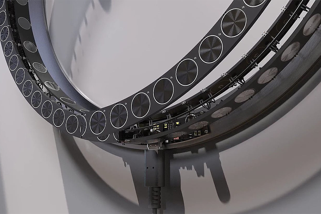 指示器的工作归功于嵌入在时钟金属主体内的132个线性PCB马达,它们支持并连接24 / 7、365昼夜工作的磁场!这提供了一个电磁场,只要时间保持移动,该电磁场就能使球保持旋转。
