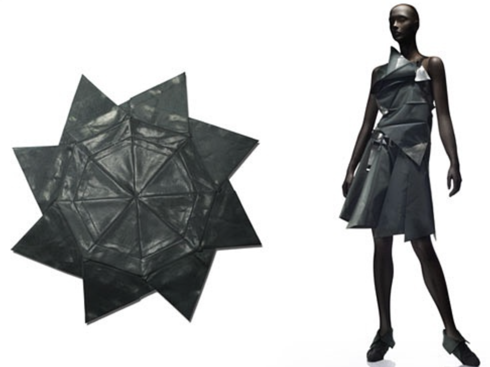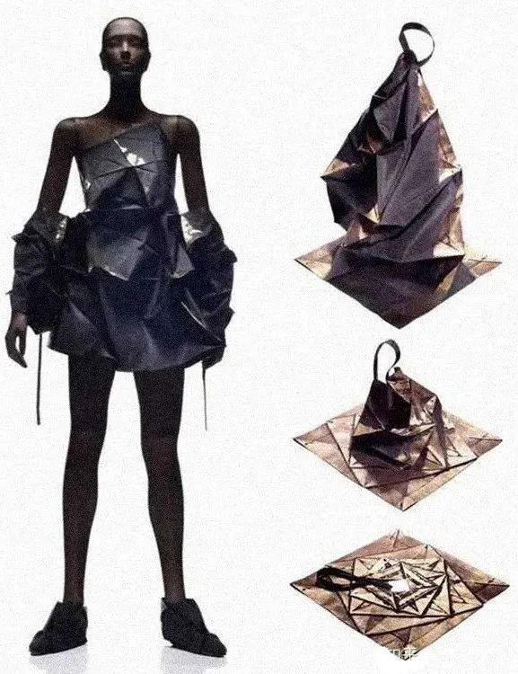 三宅从日本传统折纸艺术(Origami)中找到了将一块静态的布赋予生命的方式,即打破二维与三维的界限,超越了服装的传统定义。