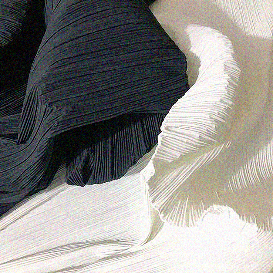A-POC(A Piece of Cloth “一块布”)为基底,在单根织物上裁剪服装,衣服在铺展时无比贴合地面,仿佛一件工整的艺术品,除了精巧的折痕,不能见其它。
