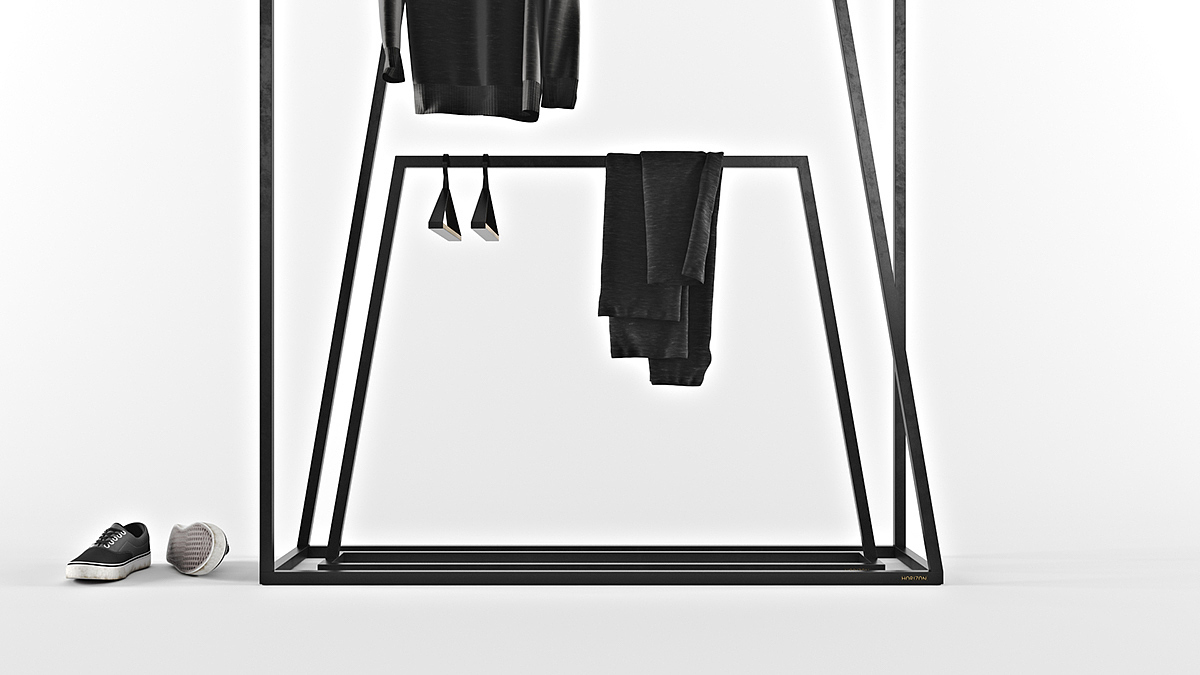 擅长极简风格的 Vetrov 为这个系列设计了几款由黑色金属框和木制隔板构成的衣架,干净利落的线条前后交错,同时又保持了一种微妙的一体感。