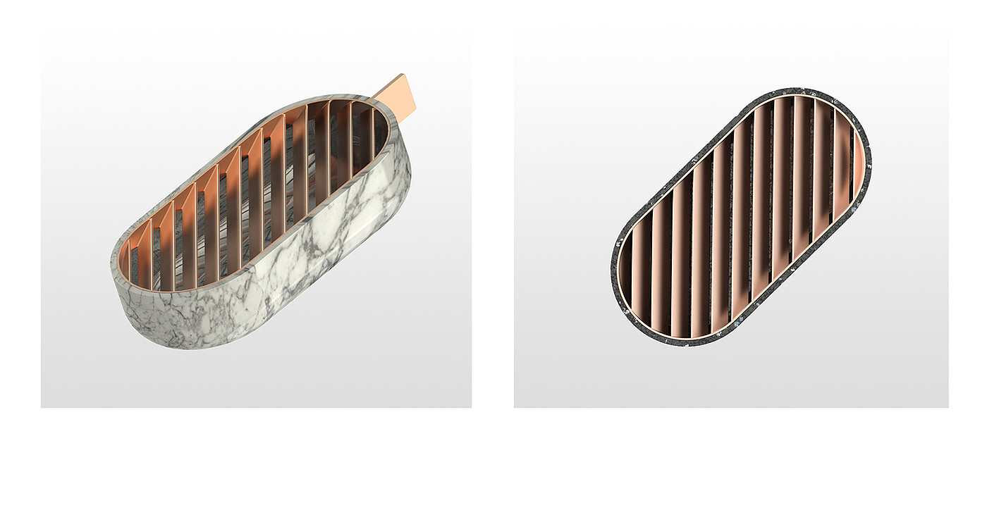 半封闭烟灰缸,Denis Dolganov设计,一款带来全新体验的烟灰缸设计,易于使用及清洁,材质为石材和黄铜材料,外观为百叶窗形状。