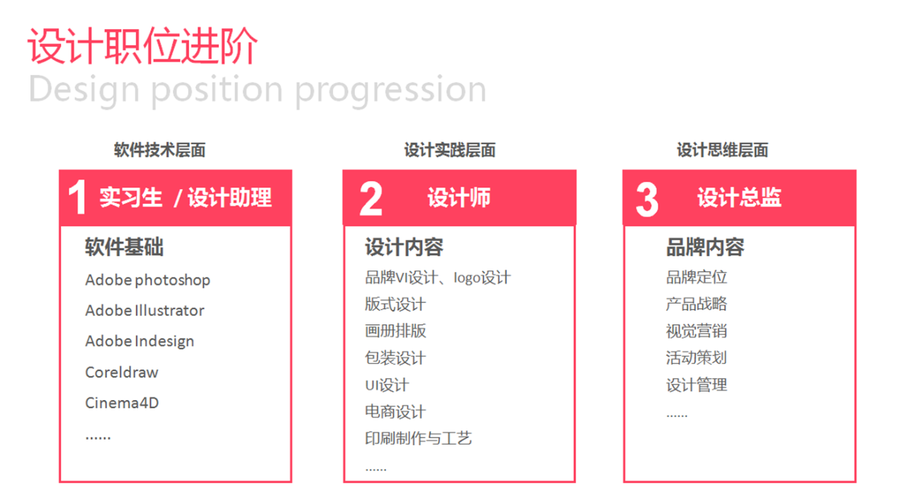 平面设计师的进阶一般过程:【实习生/设计助理】-【设计师】-【设计总监】
