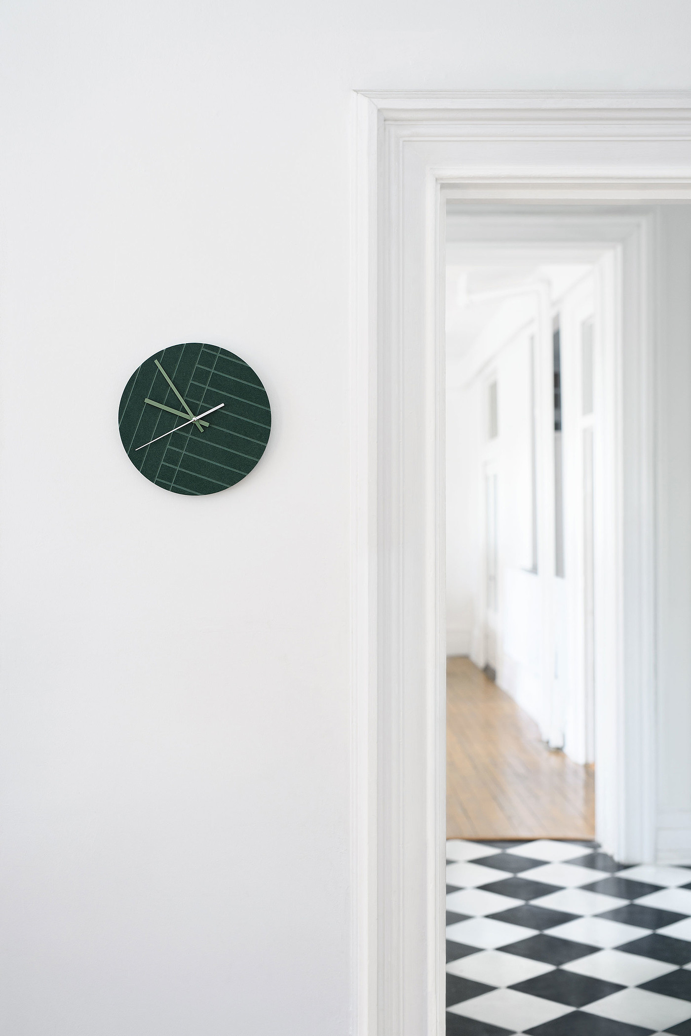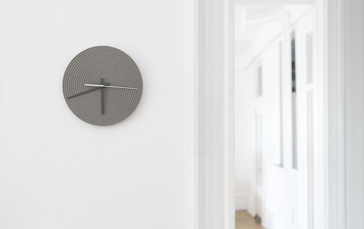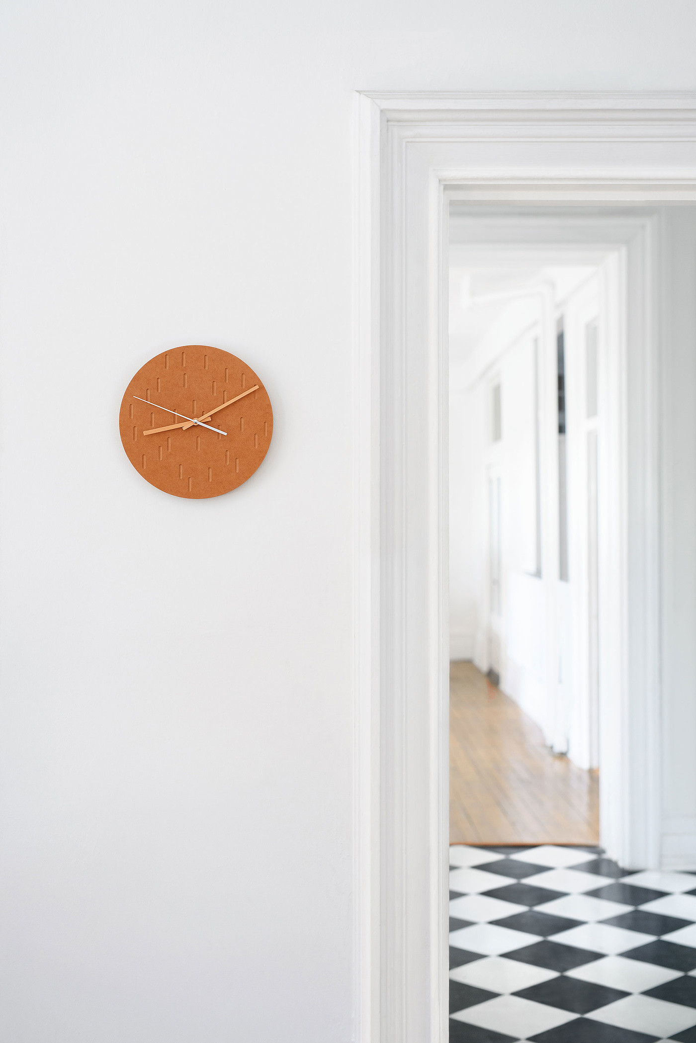 这款挂钟是由蒙特利尔设计师mpgmb设计的一种最小时钟的集合。限量版的时钟是用有机染料染色的,都是在蒙特利尔生产的。在直径10英寸的地方,表面有凹凸不平的纹路,排列着线条和形状的组合。时针和分针被涂上颜色,以配合时钟的表面,用秒针形成对比。