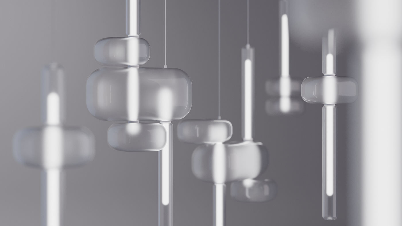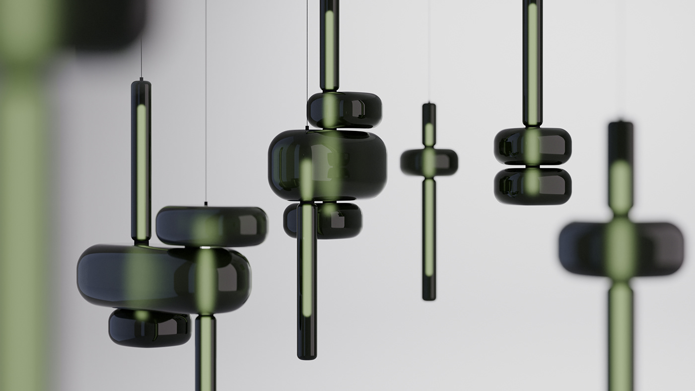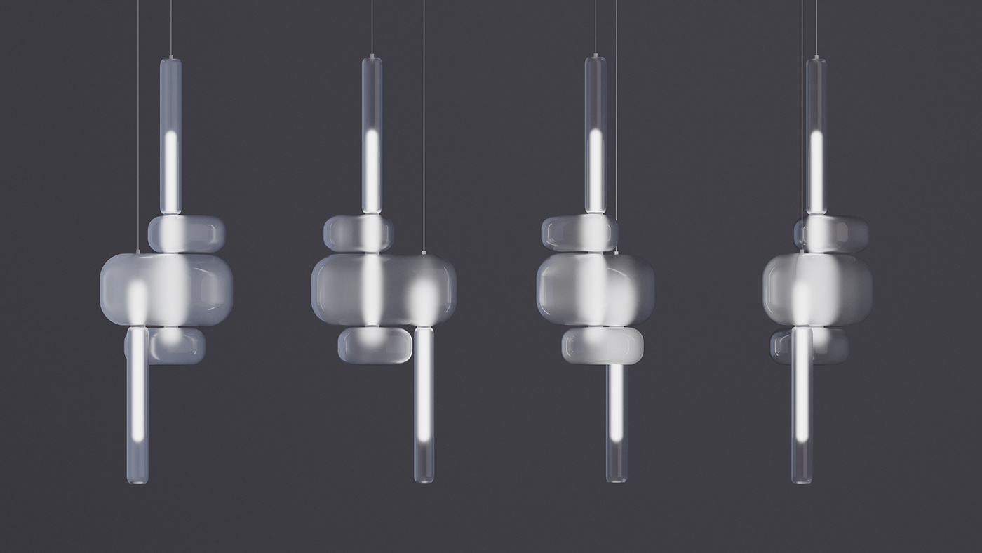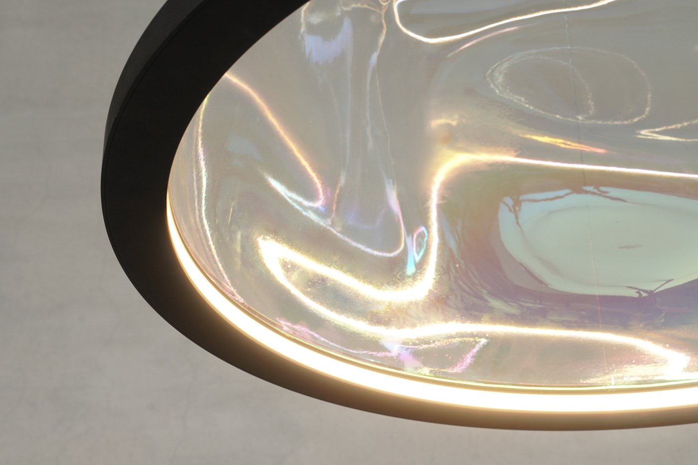 Air Shape试图以一种近乎空灵的方式表现照明灯具的造型,黑色铝环嵌入LED灯带,向内侧发光,满足上下照明需求,外形是用传统的吹制玻璃制造的,表面随机而柔和的凹凸和彩虹色在其表面呈现出不同的光表现。