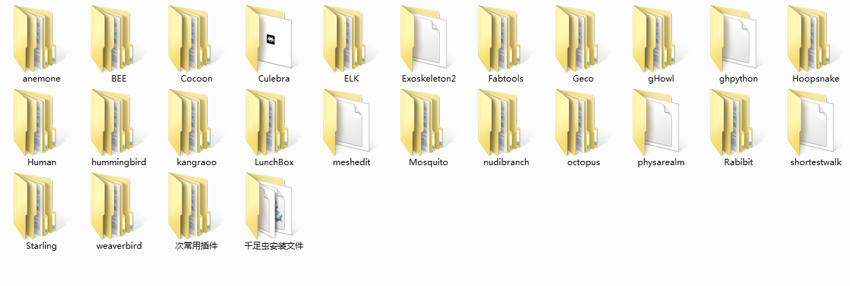 包括 Anemone、Cocoon、Culebra、ELK、Fabtools、Human、hummingbird、kangaroo、LunchBox、Mosquito、nudibranch、Octopus、physarealm、Rabbit、shortestwalk、starling、weaverbird、Millipede、IntraLattice、Chromodoris、Ladybug & Honeybee、Bifocals、Quelea、Bubalus_GH 等建筑行业常用插件!