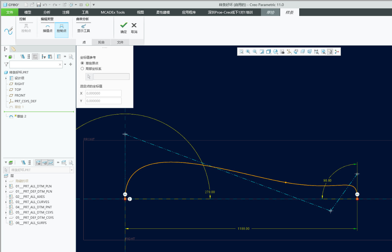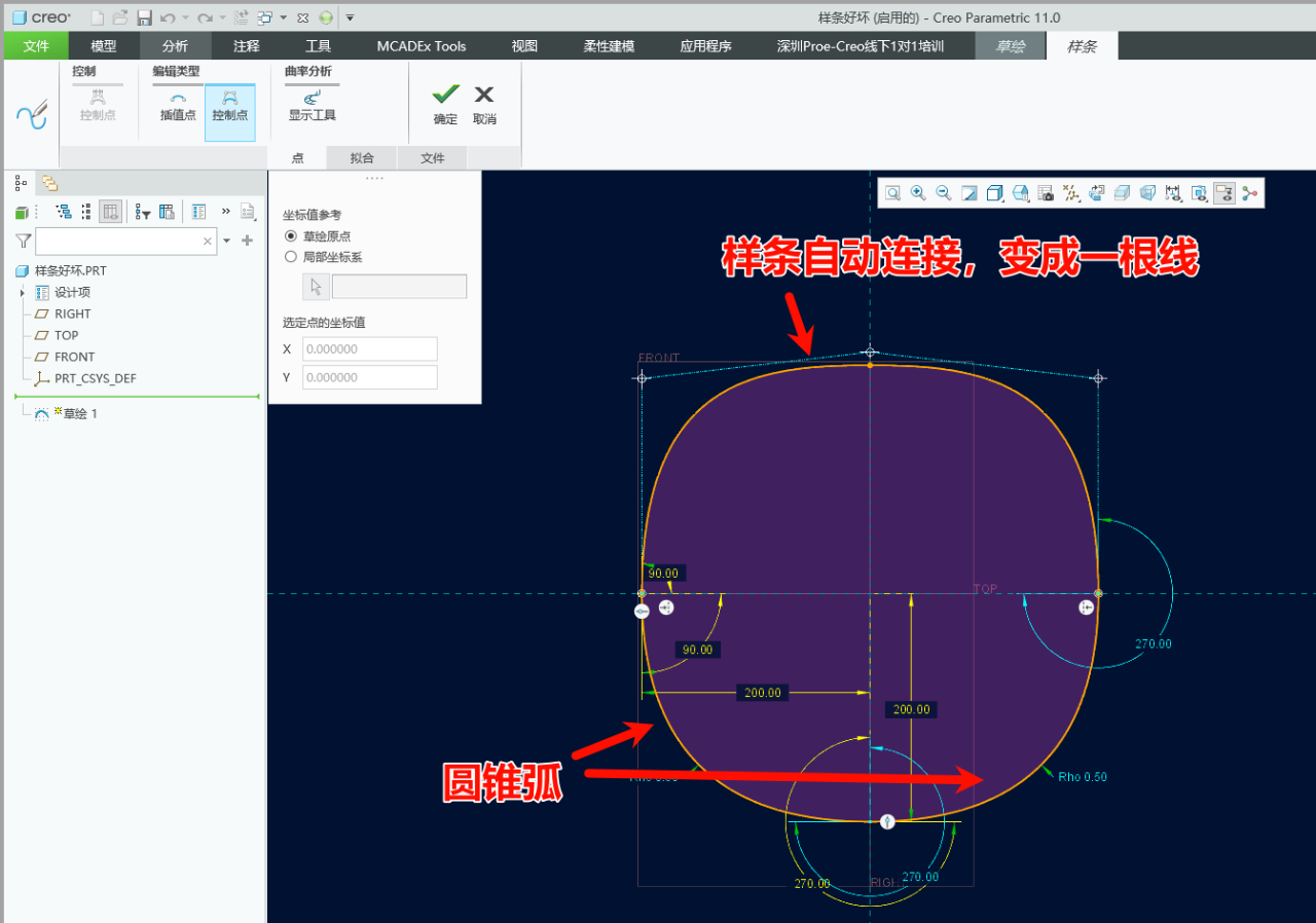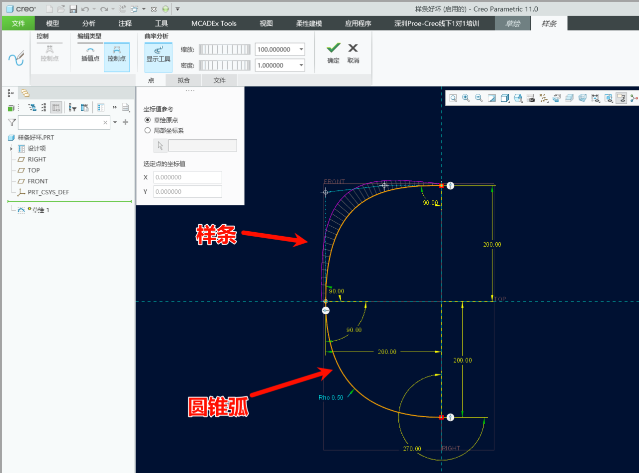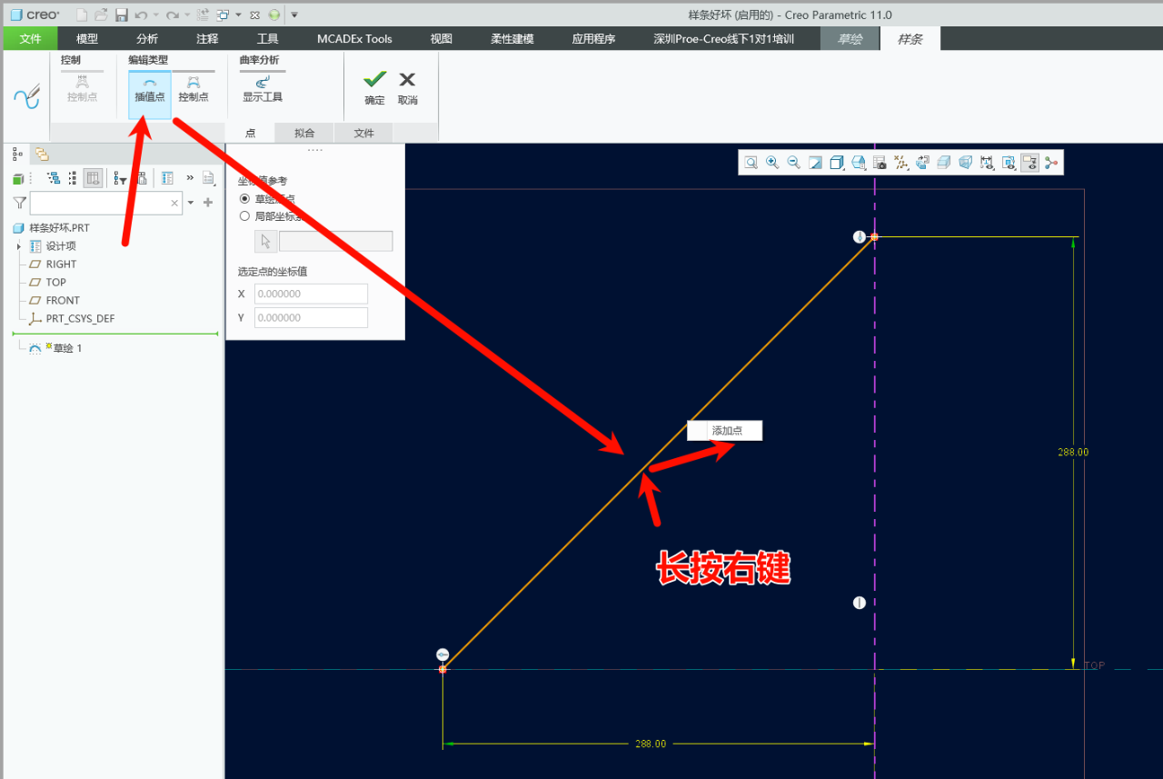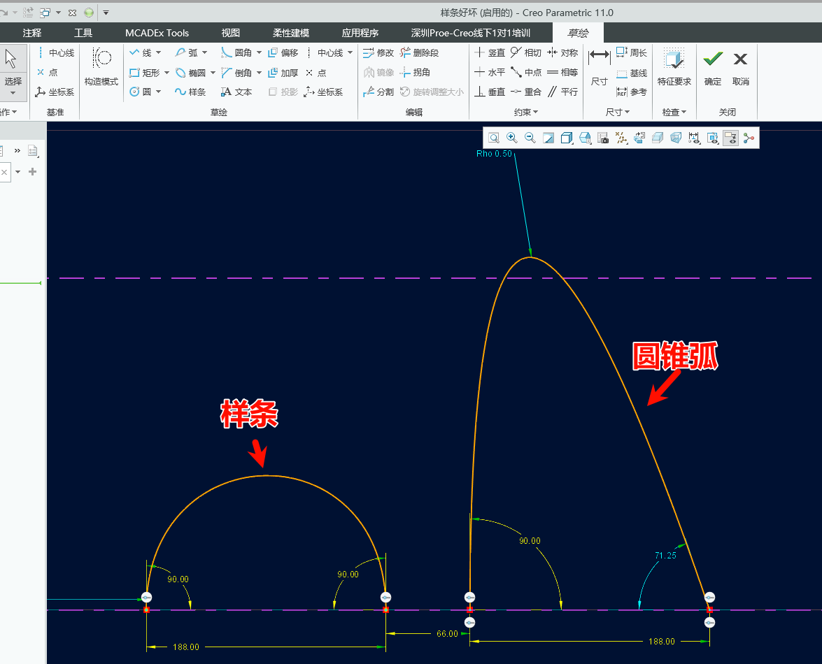 绘制样条,标注距离尺寸之后,依次点取样条-点-线(三者顺序随意,但是必须将交点选上),然后中键标注角度尺寸!