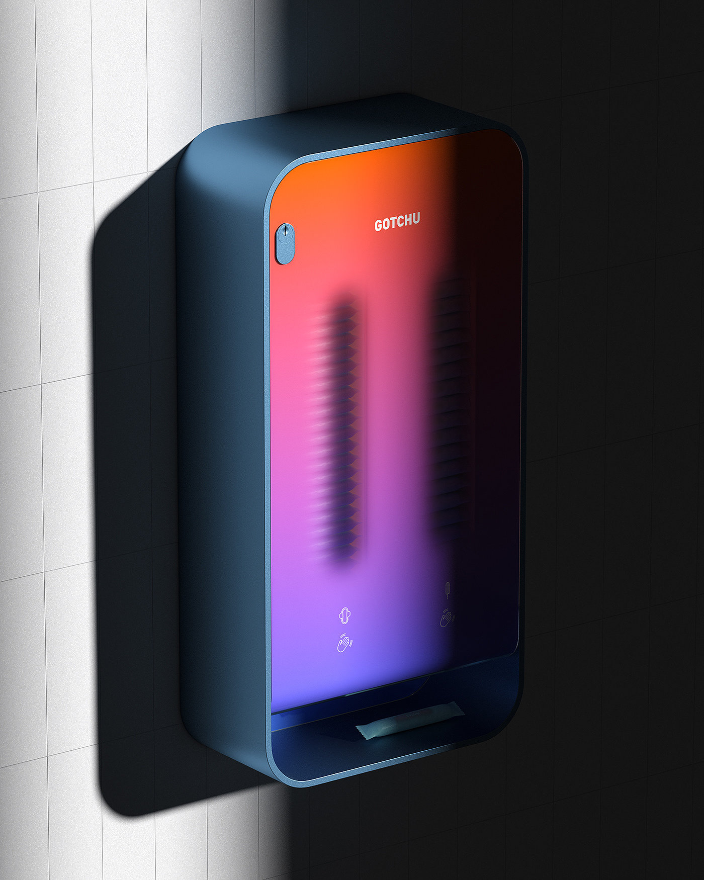 GOTCHU 是一款专为女性用户而设计的公共设施产品设计,一款女性福音产品设计,它是一款智能卫生巾分配器设计,能够为公共场合里没有准备的女性群体提供免费的卫生巾或卫生棉条,设计师设计了运动传感器用于分配,避免超额配发。