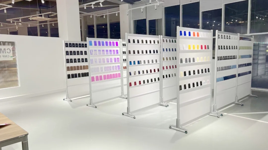 为了让参观者便于认识、学习和理解CMF创新实验室,此次实验室建设为每个工艺材料样品展区配备了标识引导说明,可以帮助参观人员一目了然了解实验室各个展区的功能划分,快速及系统了解每个工艺材料样品展区。