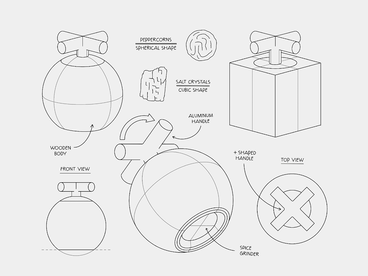 这是一组创意调味瓶设计,分别为盐和胡椒的调料瓶,其中盐味立方体,胡椒为球体,传统几何极简造型的加持下极具艺术感,对应的还有色彩设计,即盐罐为纯白立方晶体,胡椒罐则为黑色圆体,更具辨识感。