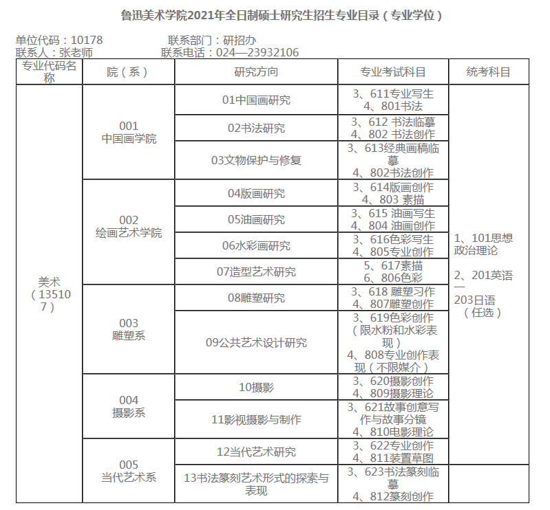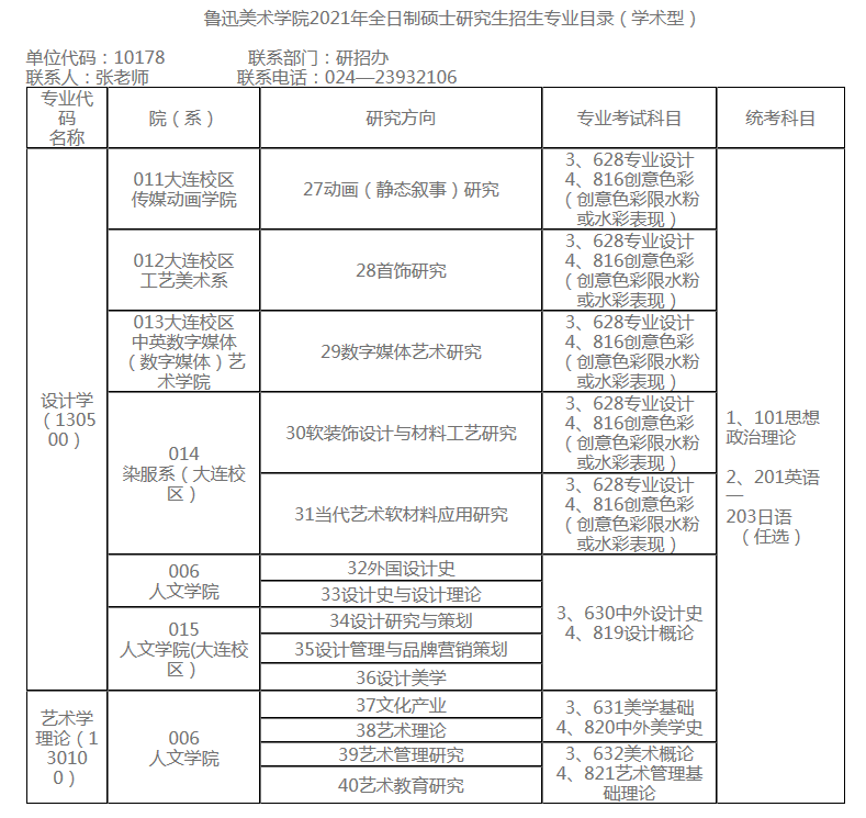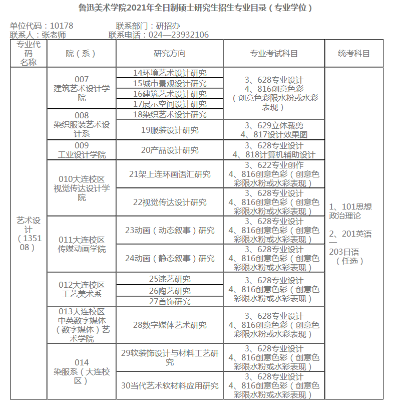 鲁迅美术学院2021年硕士研究生招生专业目录