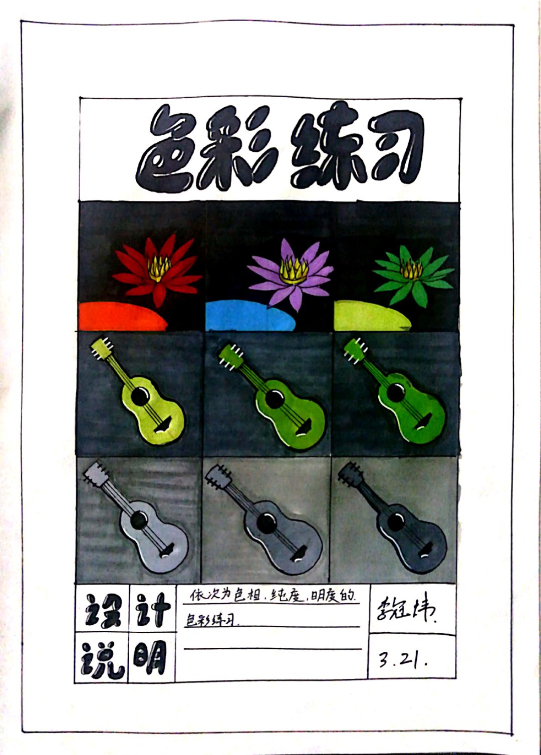 冠炜,这张色彩属性,有体现色相、纯度,明度,但是需要注意的是马克笔不要画出边框,边缘出一点点的可以用白色高光笔去掉,在平时中可以多以正方形来练习马克笔的控制能力。