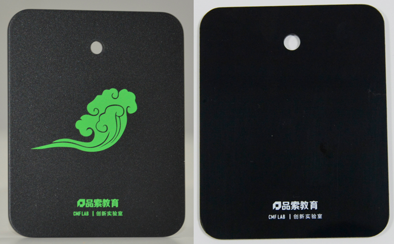 五、镭雕工艺与丝印工艺的区别镭雕的产品,字体、图案具有透光性;丝印的产品是不透光的;镭雕的产品,字体、图案的颜色是材料颜色,底色是油墨的颜色;丝印的产品恰恰和镭雕产品相反;从耐磨性来说,镭雕的高于丝印;丝印相对于镭雕来讲,图案的层次更加丰富,图案的颜色也可多变,并且丝印工艺也不会对产品表面进行破坏;两种工艺利用的原理是不一样的,镭雕使用的是光学刻蚀原理,而丝印是物理原理,让油墨黏着在上面;价格是不一样的,但价格的高低还是因字体、图案的难易程度来判断的。 品索CMF实验室 镭雕工艺(左)和丝印工艺(右)对比