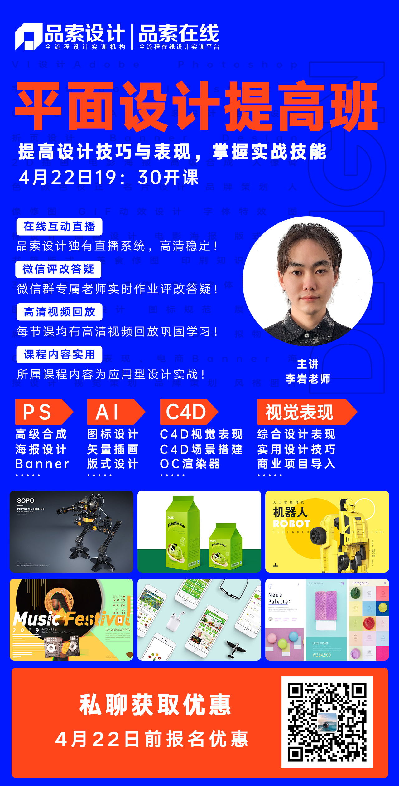 本课程将从平面视觉三大软件PS、AI、C4D提高应用,