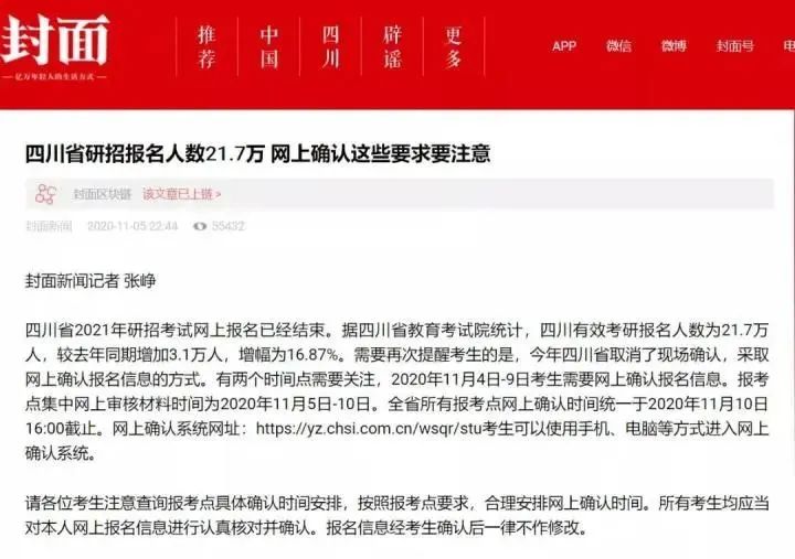 先是媒体在网络上发布了四川省研招报名人数的文章,之后人民网搜狐号也转载了文章。