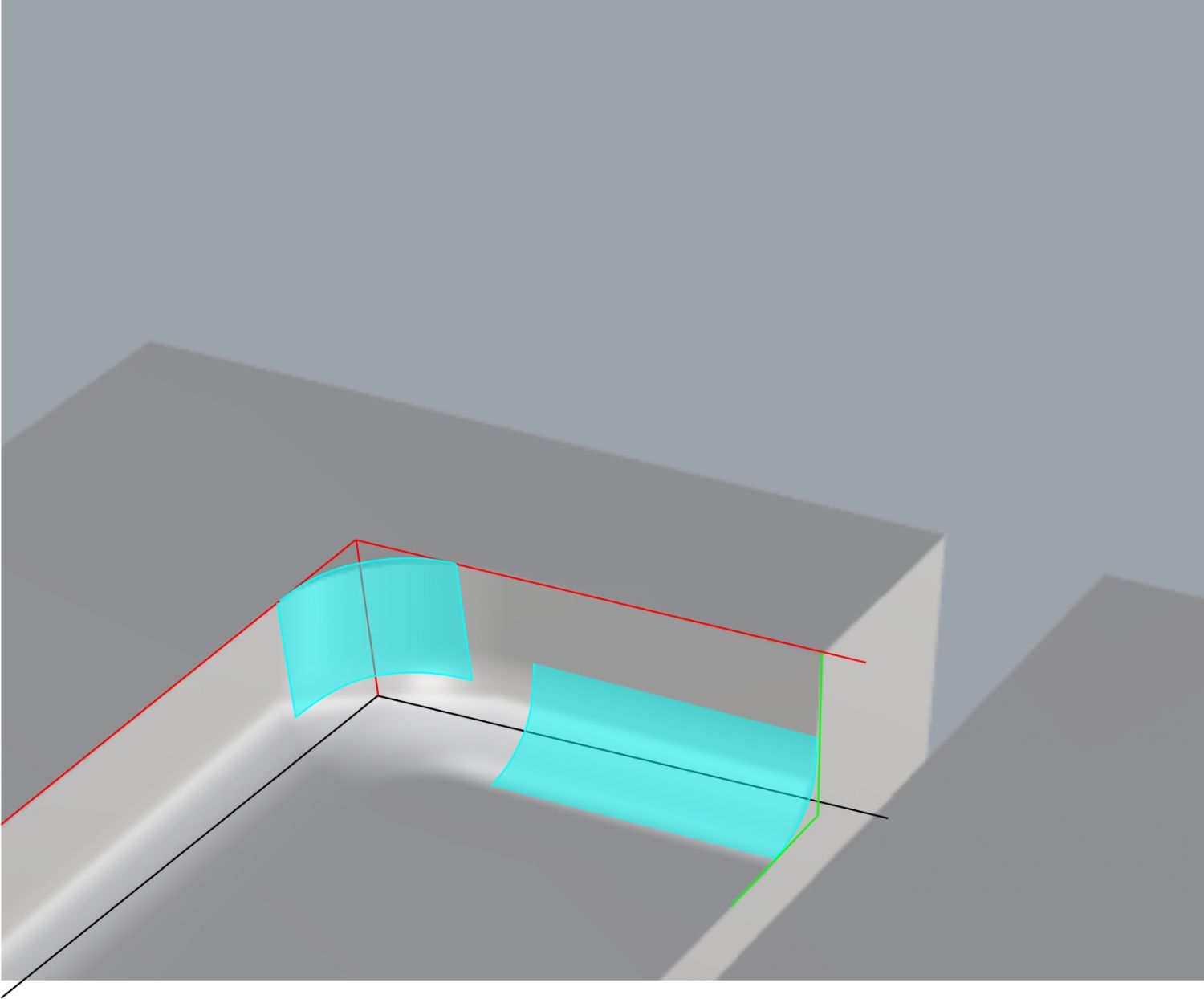 如上图所示,一般加材料都是在模型的内侧进行倒圆角处理时候,圆角边变成圆角面,此时进行加材料,如上图 竖直红色线为原始边,进行圆角后,青色区域为加材料区域