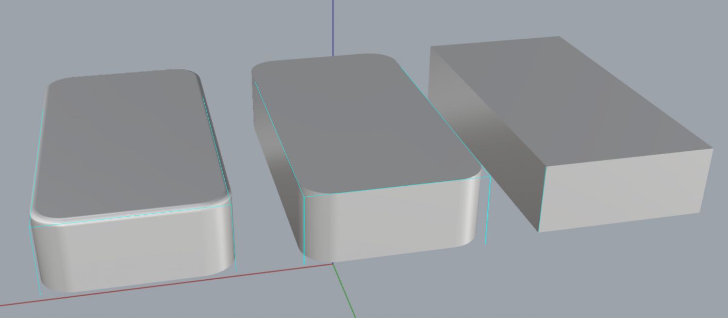 减材料前,模型为棱边,视觉表现锐利,给人不安全感,倒圆角后,如青色线条所示,圆角由竖直线条变为一个圆角面,相当于切剪掉一个三角形区域。使得模型视觉表现更圆润,光感丰富,更有亲和力。