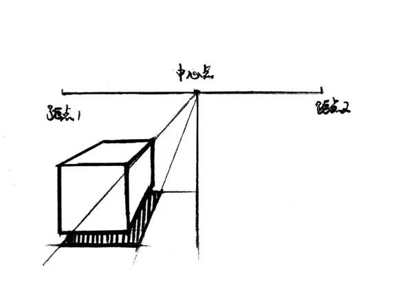 1.作出一条水平线,并标记出中心点以及两个距点,从中心点向下延伸出视线后,画出一个正方形;