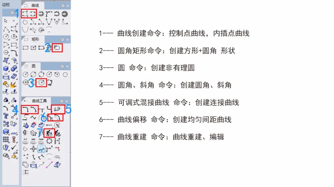 在曲线构建和编辑中,最常用的命令如上图所示,在曲线创建中,常用命令是1中所示的 控制点曲线、内插点曲线 两个命令。其中,控制点曲线主要是在平时的曲线绘制中应用,内插点曲线在做两个端点连接时候使用是最为方便的,连接后在进一步调整曲线形状,非常方便。