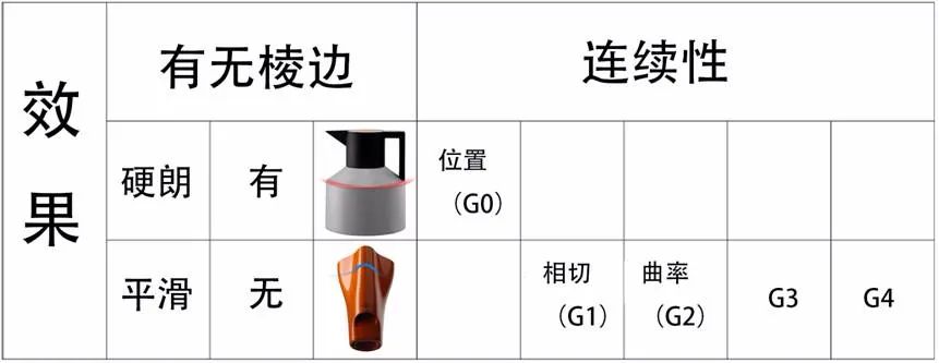 PS:连续性,是指设计数字化表现中,基于造型需求,为了实现相应的美学效果,软件应用时,两条曲线或两个曲面相交处要形成的关系。在软件应用中,可以分为:位置关系(G0),相切关系(G1),曲率关系(G2),G3,G4四种设置。