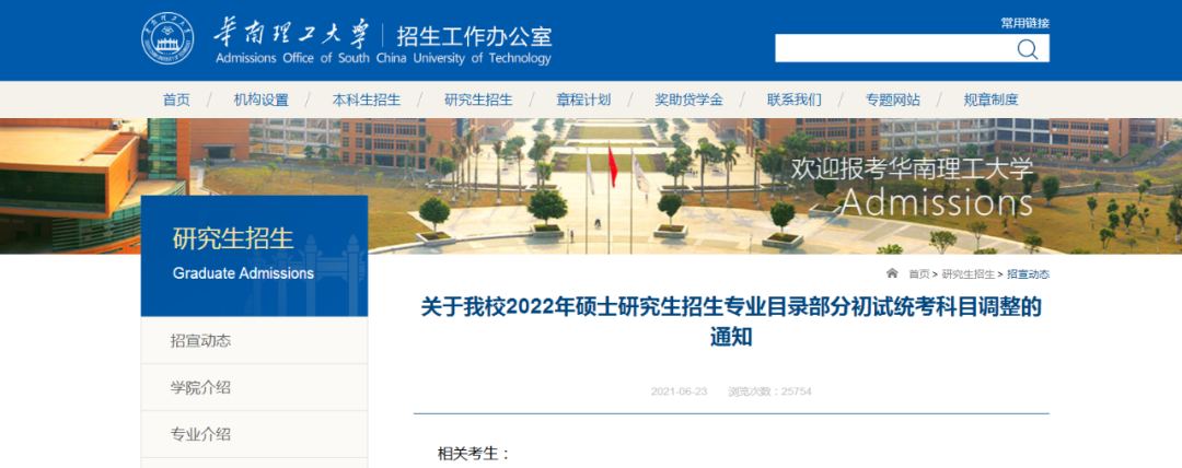 华南理工大学2022年硕士研究生招生专业目录部分初试统考科目调整的通知