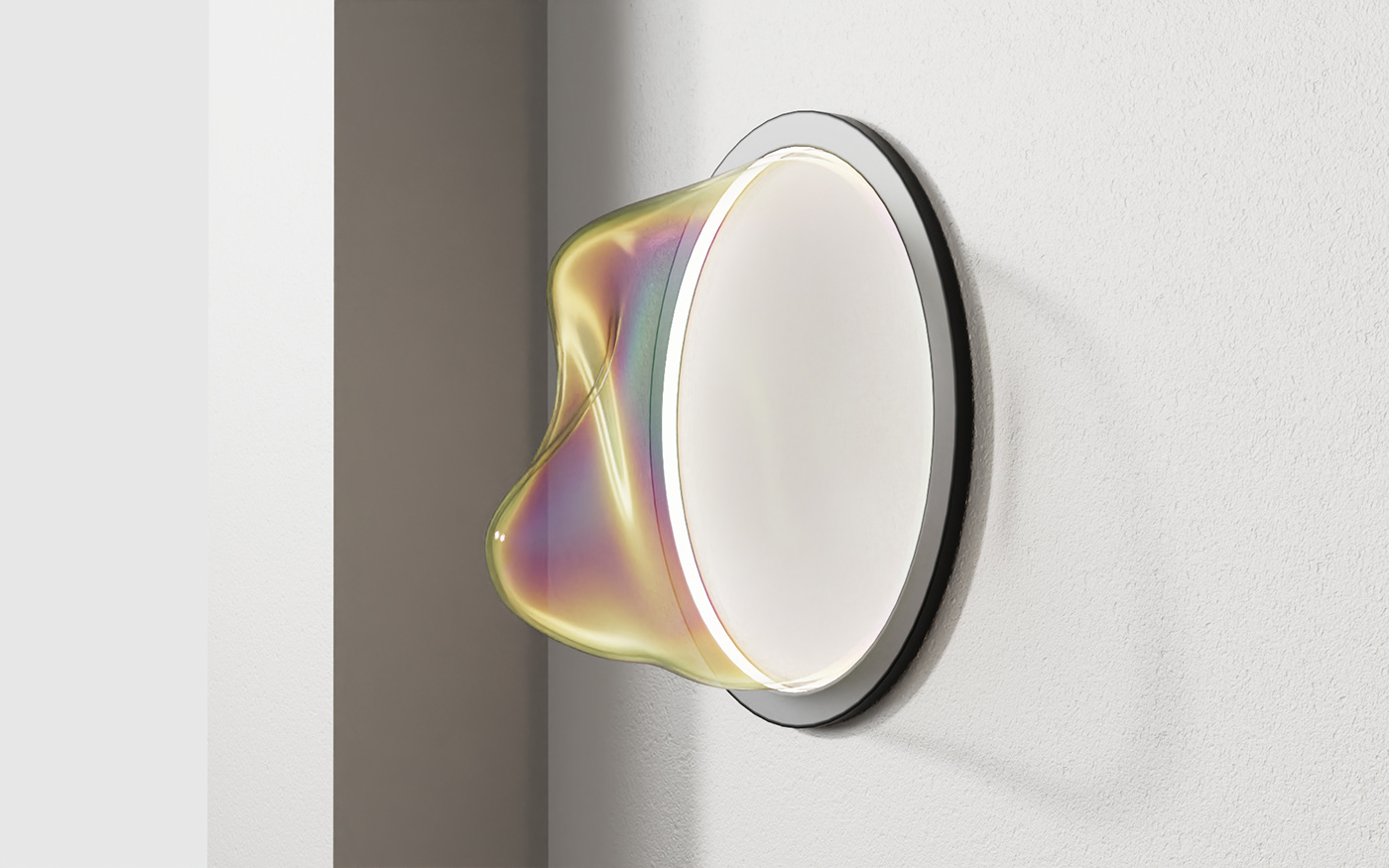 Air Shape试图以一种近乎空灵的方式表现照明灯具的造型,黑色铝环嵌入LED灯带,向内侧发光,满足上下照明需求,外形是用传统的吹制玻璃制造的,表面随机而柔和的凹凸和彩虹色在其表面呈现出不同的光表现。