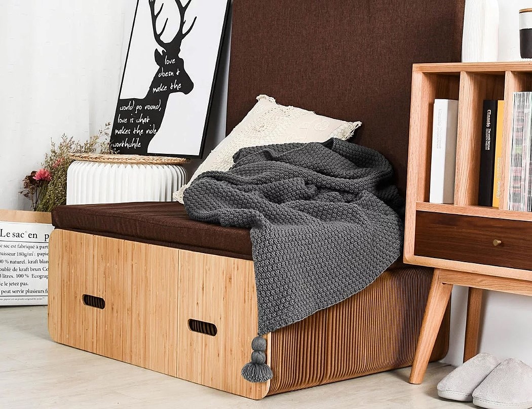 Cuna 是一款环保家具-长凳设计,与传统家具不同,它不需要螺丝,也没使用粘合剂,作为一款环保家具,它的材料是纸板来设计,由两张坚固的纸板和五块额外的纸板组成,提供了独特的美学和DIY体验。