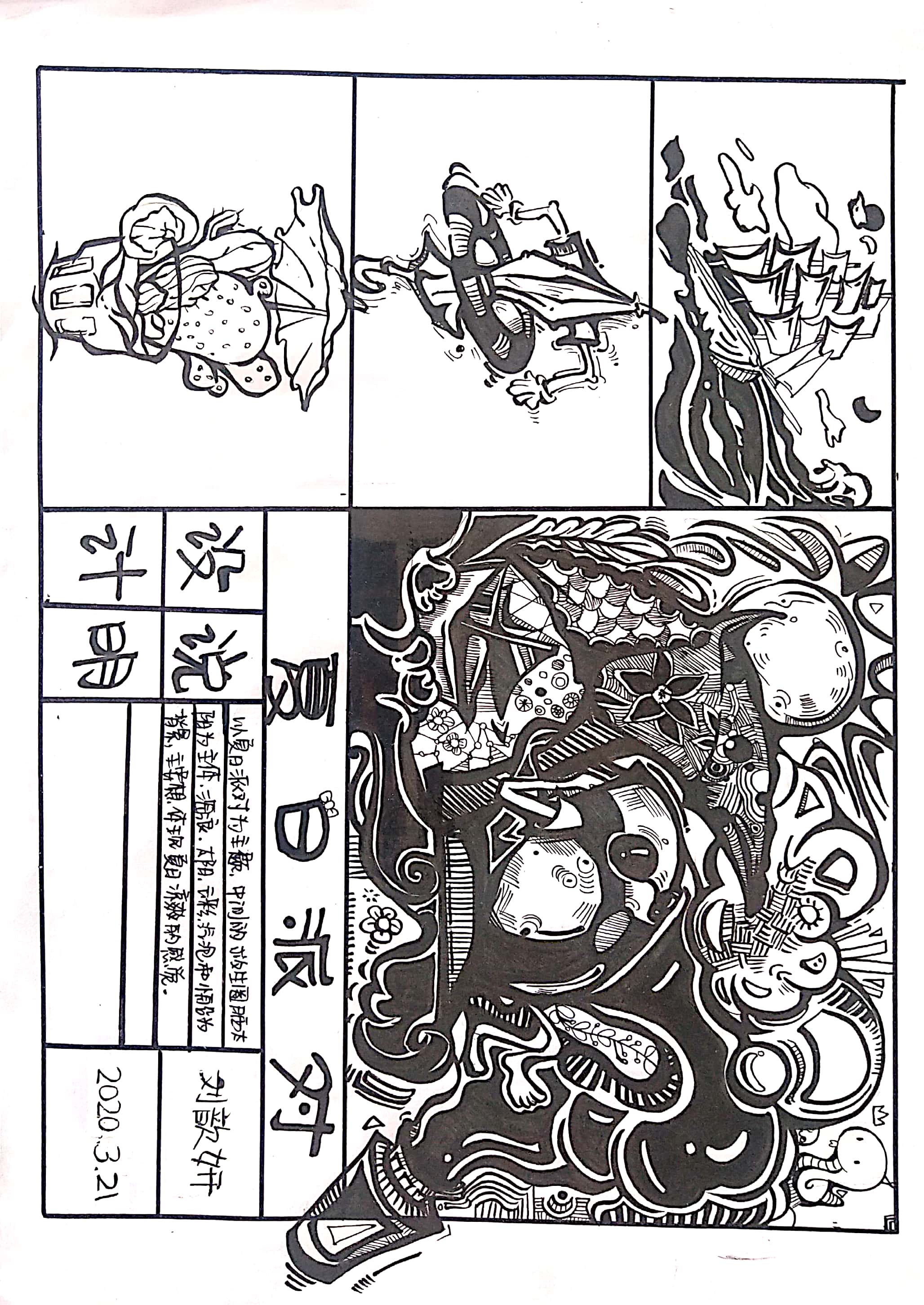 馨妍,这张画体现了构图饱满,线条流畅,画面内容丰富,但是有几个问题需要改进的: ①画面要有主体物,周围的物体围绕着主题进行扩散。 ②内容形象要表现突出。 ③黑白灰的关系要在拉开一点,现在感觉黑色区域有点多。 合理调配白色与黑色区域的对比,内容围绕着主题去体现,加油哦。