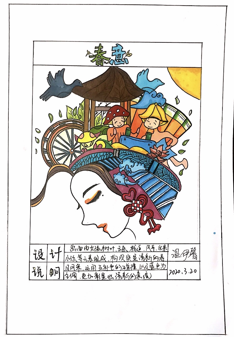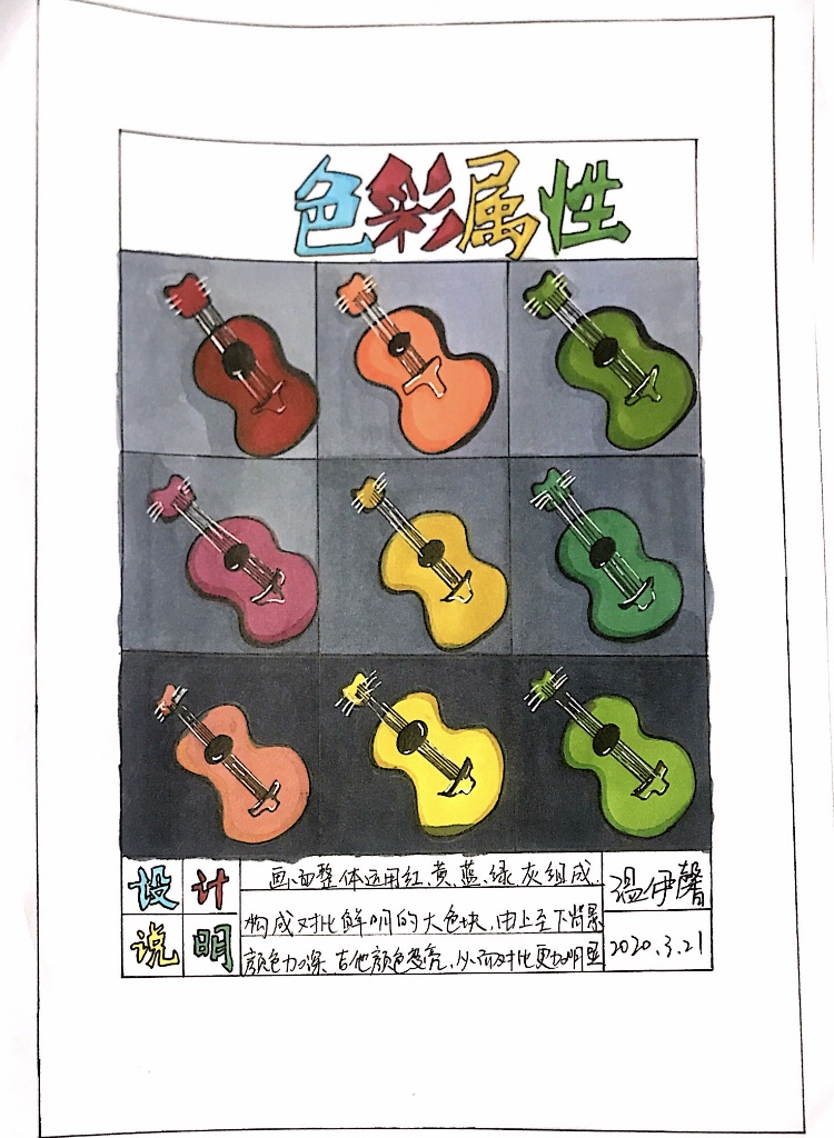 伊馨,这张色彩属性是体现色相、明度、纯度,画面当中还缺少明度,指颜色的高中低,再一个就是要注意马克笔不要画出边框外,可以用白色高光笔去掉,这样会体现更加整体。继续加油哦!