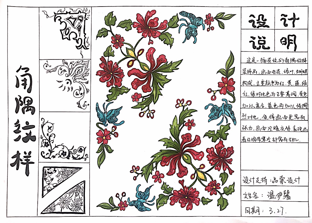 伊馨,这张角隅纹样表现的形式可以,如果画面纹样有疏密感,可以更好哦。