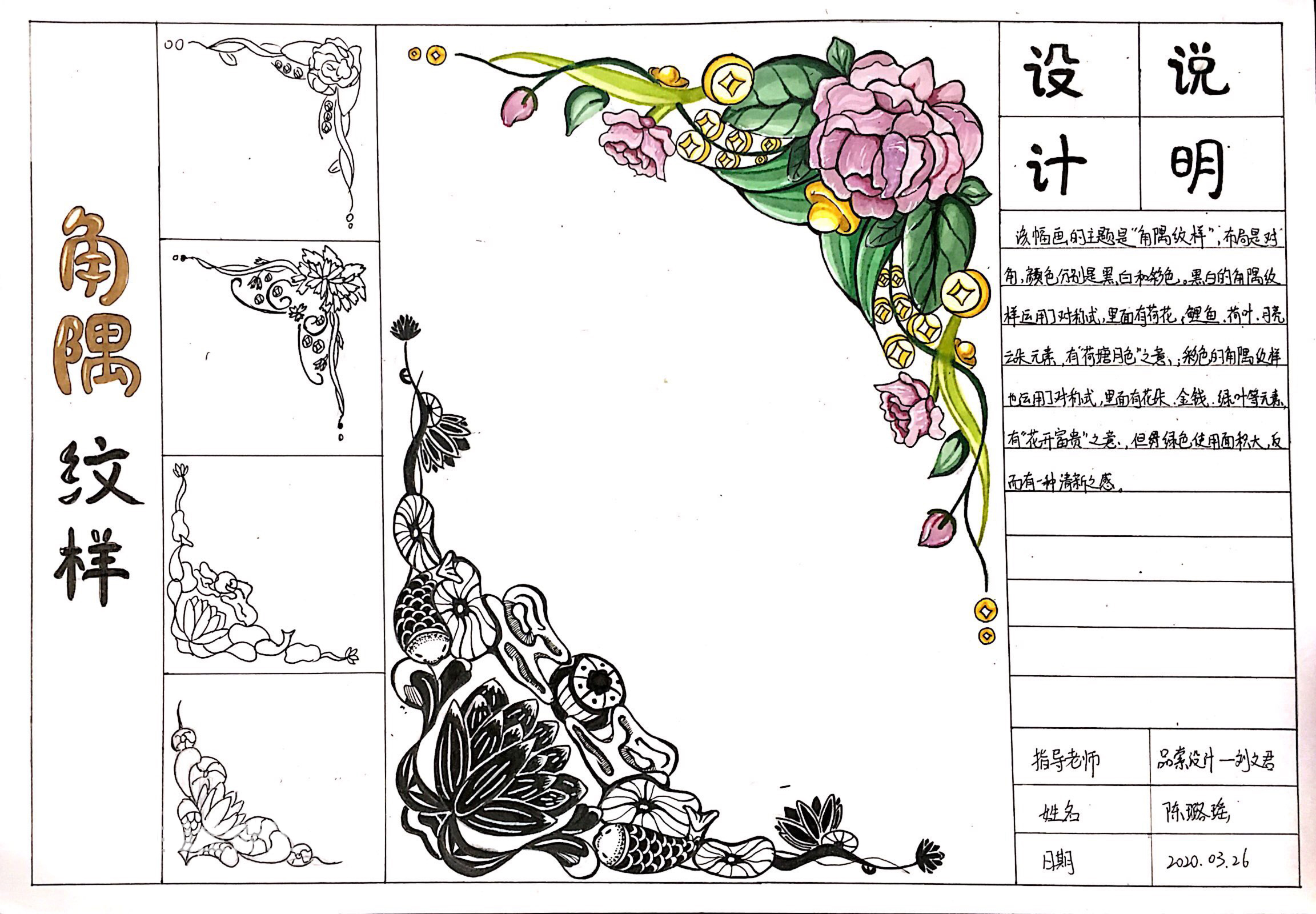 璐瑶,这张角隅纹样表现的很好,想法寓意性很有代表性,但是画面整体看还需要跟进一下的就是内容再丰富一点,这样会更好,继续加油哦,多看、多画、多总结。